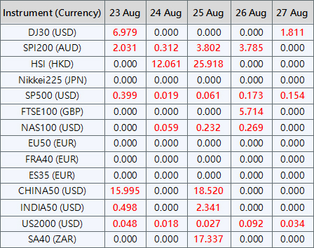 Please be advised that the dividends of the following index CFDs will be adjusted by upcoming ex-dividend dates. The comment for trading index CFDs will be in the following format “Div&<Product Name>&<Net Volume>” which show in the balance after the close of the day before the dividend payment date.