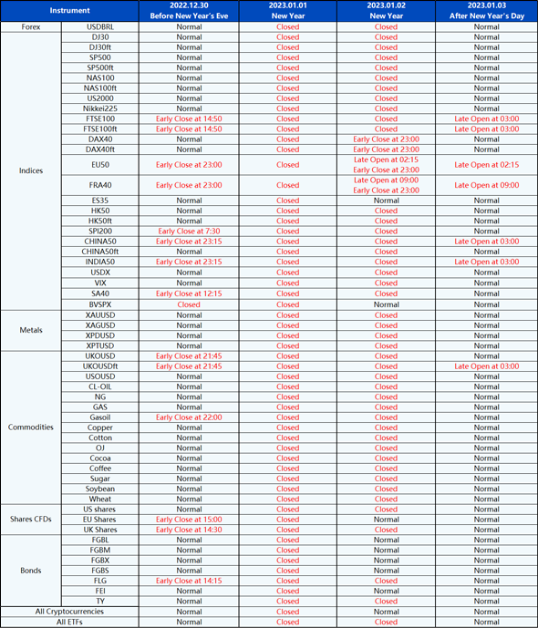 Please be advised that the following instruments’ trading hours and market session times will be affected by the upcoming New Year holidays.