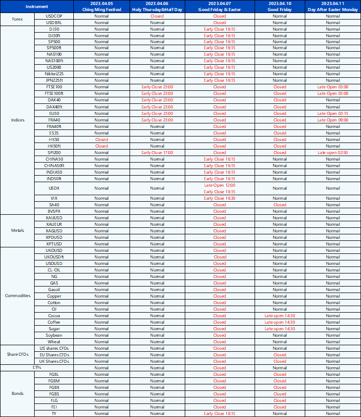 Please be advised that the following instruments’ trading hours and market session times will be affected by the upcoming April holidays.