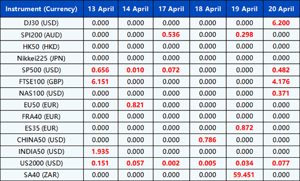 Please be advised that the dividends of the following index CFDs will be adjusted by upcoming ex-dividend dates. The comment for trading index CFDs will be in the following format “Div&<Product Name>&<Net Volume>” which show in the balance after the close of the day before the dividend payment date.